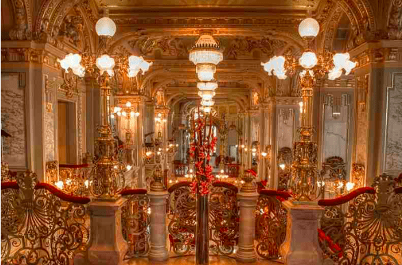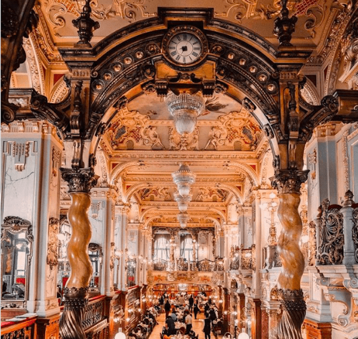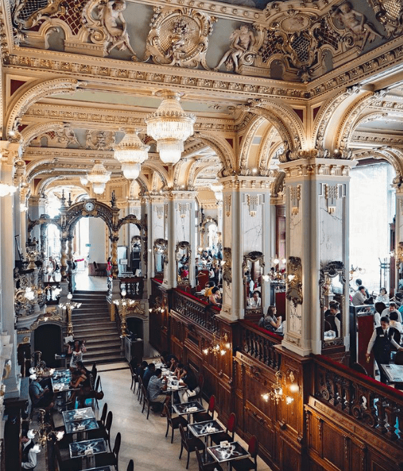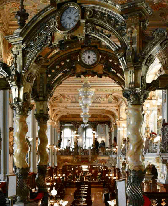 Χτισμένο σε μαρμάρινες κολώνες, με αστραφτερούς πολυελαίους, εντυπωσιακές νωπογραφίες και επίχρυσες λεπτομέρειες, το συγκεκριμένο coffee shop σε μεταφέρει σε μια άλλη εποχή. Υπάρχουν καθίσματα σε πολλαπλά επίπεδα στο κατάστημα, ενώ τα καλύτερα βρίσκονται ομολογουμένως στα αριστερά της εισόδου – εδώ θα είστε στη μέση της μουσικής και της δράσης ενώ απολαμβάνετε το φως της ημέρας μέσα από τα μεγάλα παράθυρα.