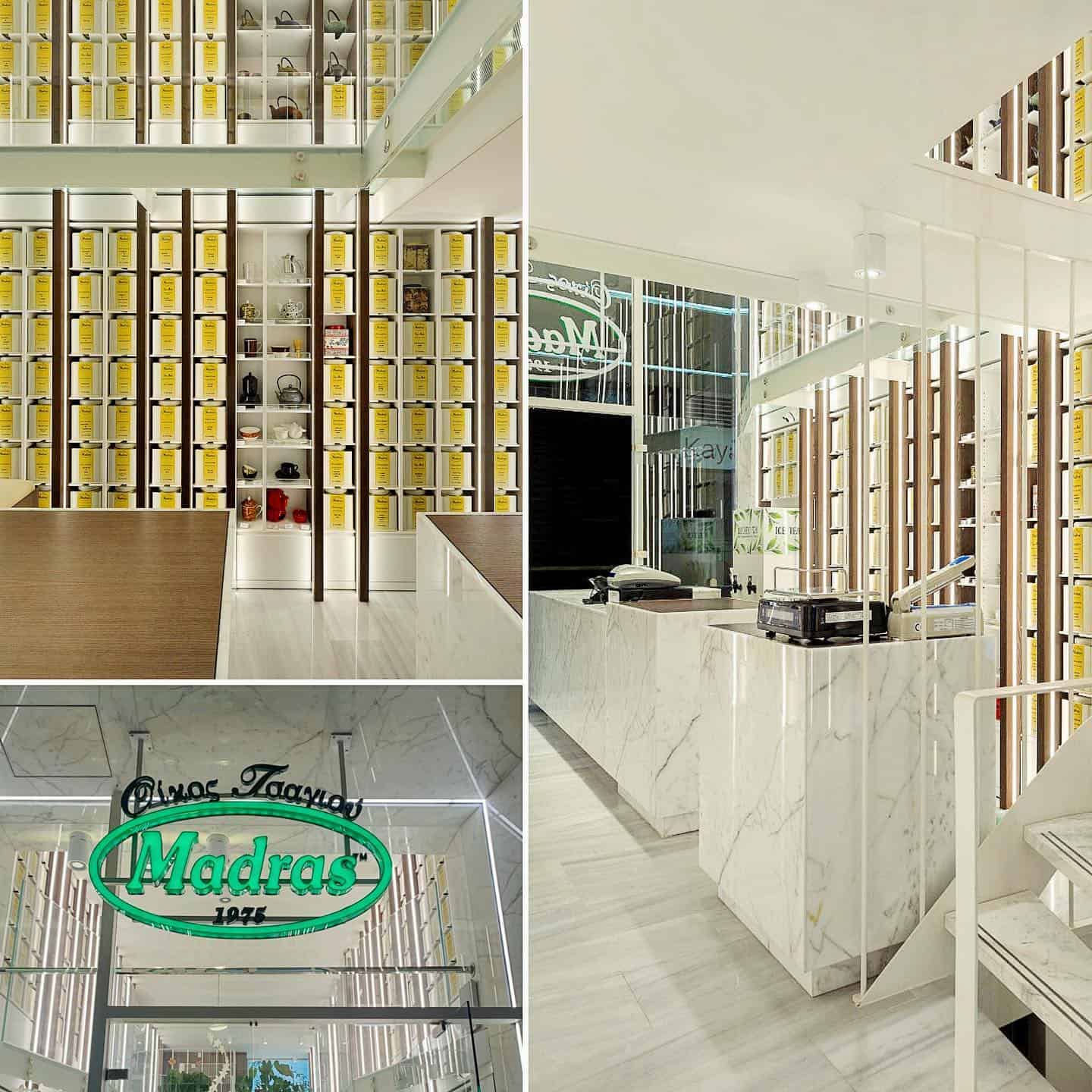 «Ναός τσαγιού» αναφέρεται στην επιγραφή και το όνομα δίνει αμέσως μια αίσθηση του τι θα συναντήσει κάποιος περνώντας την πόρτα του Madras. Στα ράφια του θα ανακαλύψετε εκατοντάδες ποικιλίες απευθείας εισαγωγής από την Κεϋλάνη, την Κίνα, την Ινδία, το Βιετνάμ. Πριν περάσετε το κατώφλι, αξίζει να γνωρίζετε ότι η εταιρεία δραστηριοποιείται από το 1975 στον κόσμο του τσαγιού, όταν ο κ. Στέφανος Παπατζιάλας αποφάσισε να αφοσιωθεί στο αντικείμενο του γευστικού του πόθου και να ασχοληθεί επαγγελματικά με το τσάι και τον πολιτισμό του. Σκοπός του ήταν να κάνει ευρύτερα γνωστό στη χώρα μας το πιο διαδεδομένο ρόφημα στον κόσμο μετά το νερό, το τσάι. Τελικά τα κατάφερε!