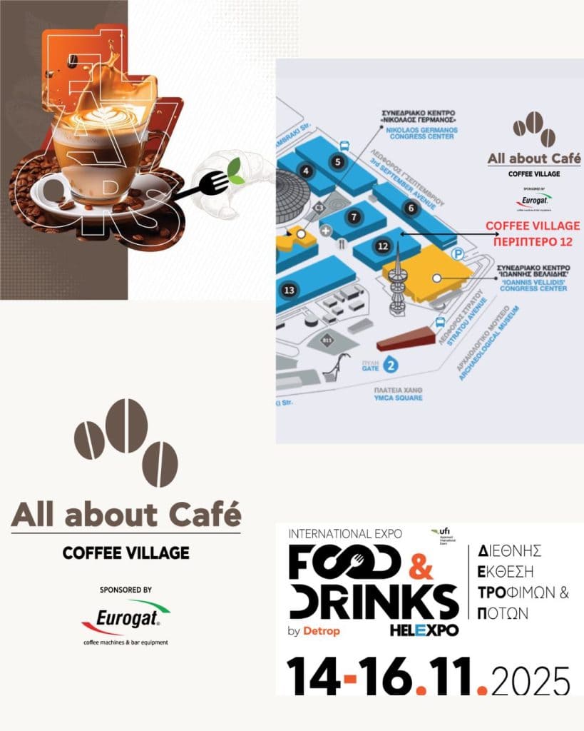 - Coffee Village: Με τη χορηγία της Eurogat, αναγνωρισμένοι roasters θα παρουσιάσουν τις τελευταίες τάσεις στην προμήθεια, στον χειρισμό, στο καβούρδισμα, στην παρασκευή και στη διανομή του καφέ.