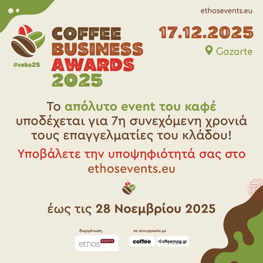 Η λαμπερή τελετή των Coffee Business Awards 2025 #coba25 θα πραγματοποιηθεί την Τετάρτη 17 Δεκεμβρίου 2025, στο Gazarte. Τη διοργάνωση υπογράφει η ethosEVENTS, σε συνεργασία με το Coffee+Brunch Magazine και το coffeemag.gr.