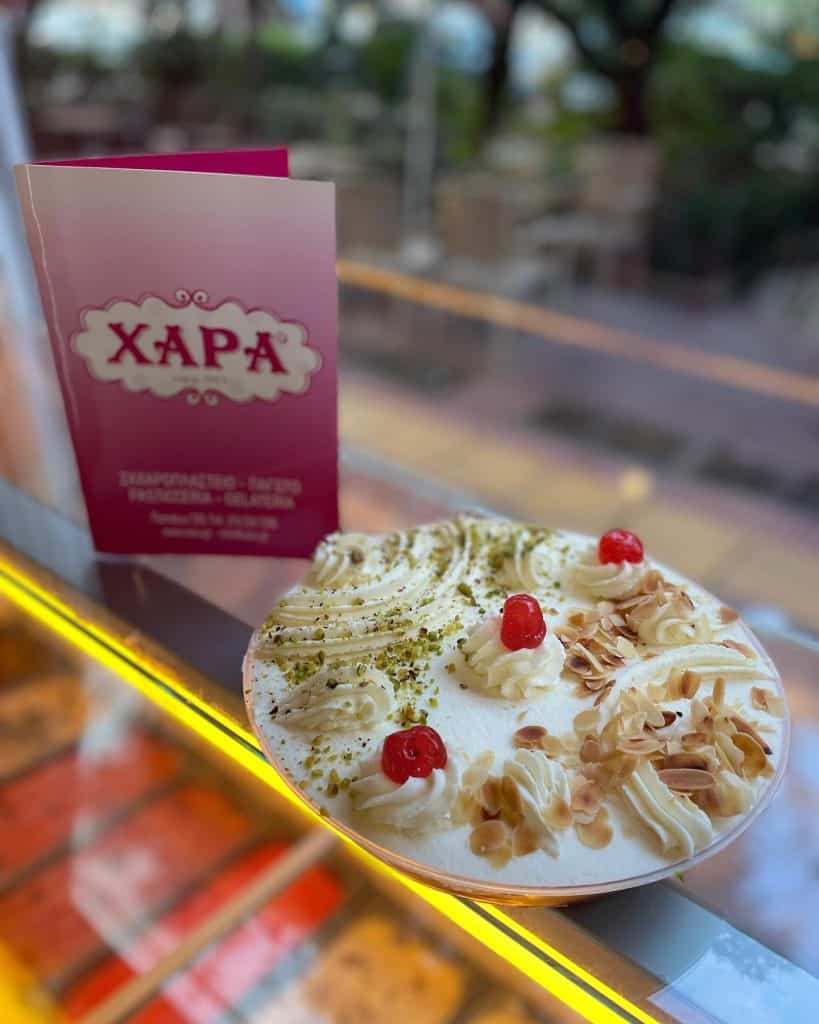 Από το 1969, το ζαχαροπλαστείο Χαρά, στην Πατησίων, αποτελεί σημείο αναφοράς για τους Αθηναίους που ξέρουν τι θα πει «γλυκό σαν τότε». Ο Νίκος Παπουτσής ξεκίνησε με μια συνταγή από την πολίτισσα μητέρα του, και το εκμέκ του έγινε από τα πρώτα «σπέσιαλ» γλυκά της Αθήνας. Οικογενειακή υπόθεση μέχρι σήμερα, η Χαρά προσφέρει –τόσο πακέτο όσο και σερβιριστό στα old school τραπεζοκαθίσματα– εκτός από εκμέκ σε διαφορετικές παραλλαγές (το γκιουζέλ με βάση πουτίγκας και βουβαλίσια κρέμα είναι το δικό μου αγαπημένο), αυθεντικά πολίτικα γλυκά, αλλά και αγαπημένα κλασικά γλυκίσματα που μας ταξιδεύουν πίσω στα χρόνια της παιδικής μας αθωότητας: από την πάστα ποντικάκι μέχρι τους μπαμπάδες με ρούμι.