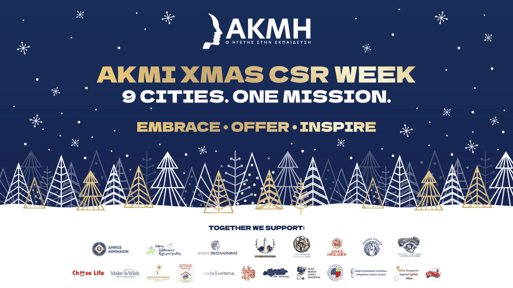Ο θεσμός AKMI XMAS CSR WEEK –ο οποίος εντάσσεται στην ετήσια στρατηγική Εταιρικής Κοινωνικής Ευθύνης του οργανισμού– στοχεύει να προσφέρει έμπρακτη στήριξη σε ανθρώπους κάθε ηλικίας και κοινωνικής τάξης, όπως επισημαίνεται στη σχετική ανακοίνωση. Παράλληλα, επιδιώκει να εμπνεύσει τους σπουδαστές, μεταδίδοντάς τους τους αξίες προσφοράς και αλληλεγγύης, ισότητας και συμπερίληψης, προάγοντας την απρόσκοπτη πρόσβαση όλων στη φροντίδα και την ψυχαγωγία, μέσα στο εορταστικό πνεύμα των ημερών.