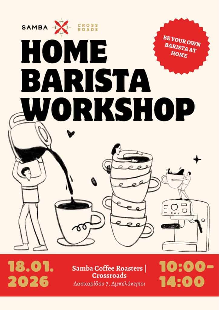 Αν θες να φτιάχνεις τέλειο καφέ στο σπίτι ή να ανέβεις επίπεδο στην τεχνική σου, η Samba Coffee Roasters σε περιμένει την Κυριακή 18 Ιανουαρίου στο φιλόξενο πατάρι του Samba Crossroads (Λασκαρίδου 7, Αμπελόκηποι), για ένα Home Barista Workshop που συνδυάζει θεωρία και πράξη.