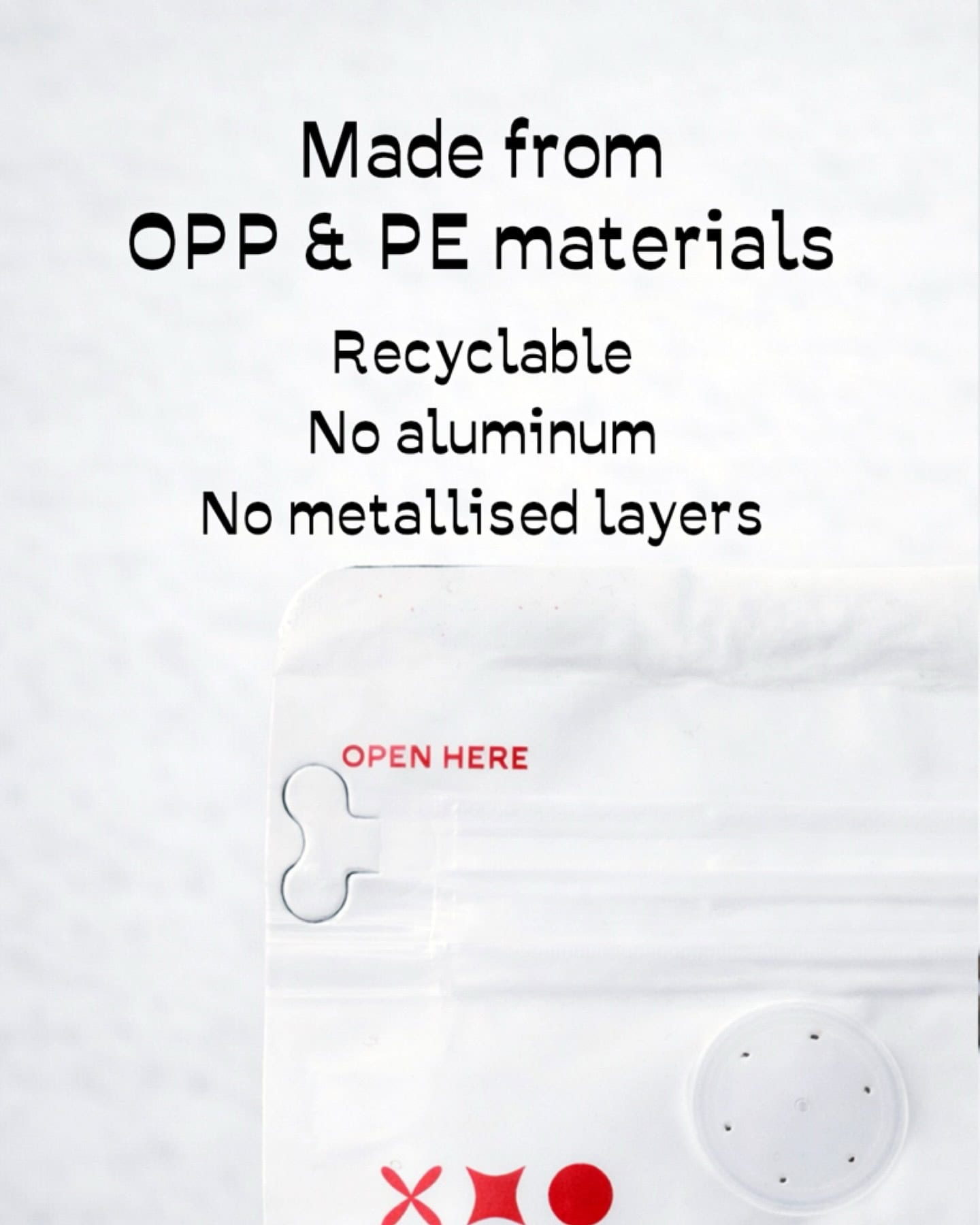 Πρόκειται για μια metal-free συσκευασία, χωρίς ξένα στοιχεία, όπως ALU και ΡΕΤ metallised. Όπως εξηγεί η εταιρεία, το νέο της υλικό αποτελείται από ΟΡΡ και ΡΕ, που ανήκουν στην ίδια οικογένεια πολυολεφινών και καθιστούν τη συσκευασία πλήρως ανακυκλώσιμη, καθώς από υλικό PE φτιάχνεται επίσης τόσο η βαλβίδα εκτόνωσης όσο και το pocket zipper.